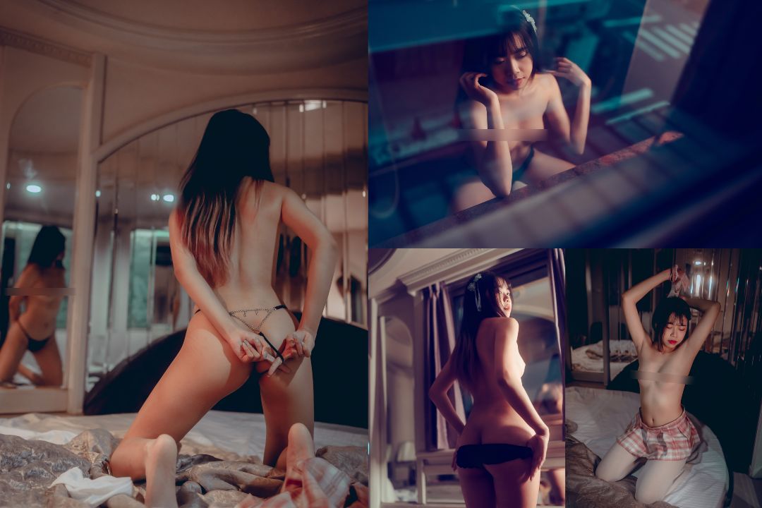 老旅館燈影搖曳,她身穿和服半解,細丁若隱若現,學生服散落一旁,上空的身影更添一絲危險而性感的氛圍。