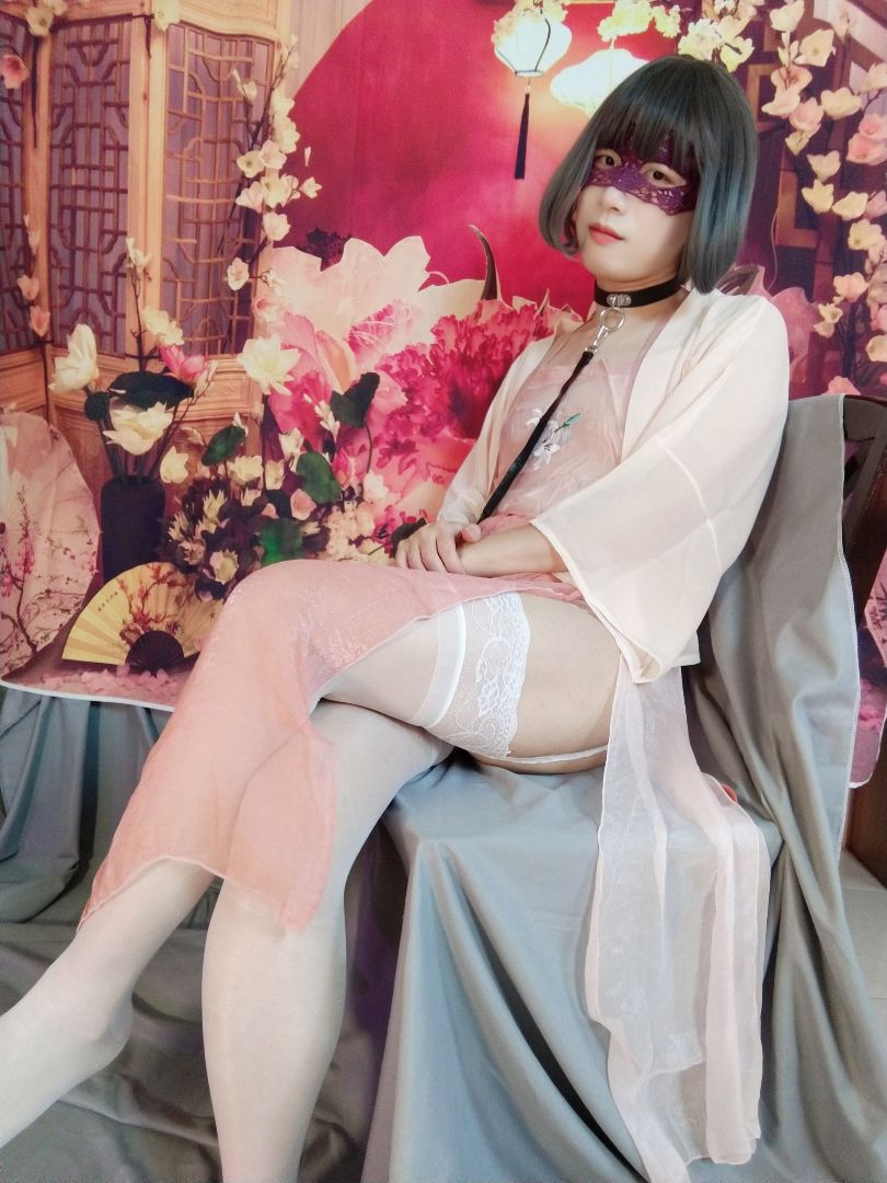 透著布料,隱約可見穿在裡面的白色蕾絲吊帶襪。 搭配著古風的背景掛布,呈現一股幽雅清香的氣息❤️